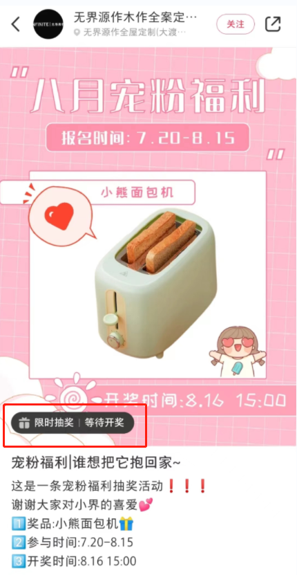 品牌方可以直接利用品牌號發(fā)布抽獎筆記,筆記發(fā)出后就會在相關(guān)頁面進行小的懸浮展示,用戶直接點擊即可參與開獎。