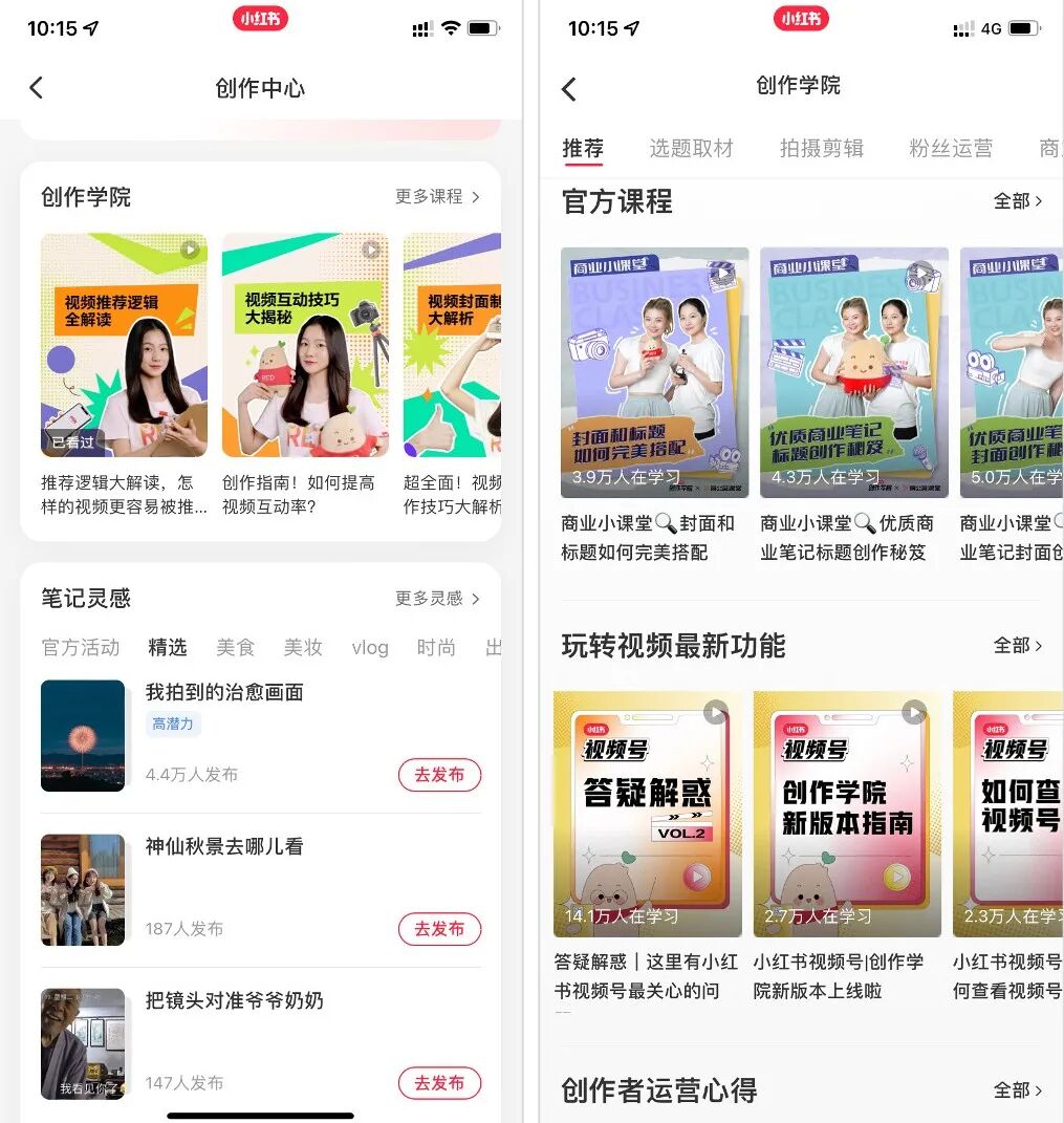 比如某篇筆記的點擊率或互動數或漲粉數不佳,就可以在“筆記分析”里找到筆記診斷,官方還會提出改善意見。第三個是知識賦能。大多數創(chuàng)作者在內容創(chuàng)作中容易遇到瓶頸,不知道怎么挑選更爆的選題、不知道怎么運營粉絲、不知道平臺的推流機制是如何的。所以小紅書還會提供一些“進階課程”,比如優(yōu)質內容教程,營銷推廣工具、營銷活動等相關課程培訓,以及成功案例的分享,以此幫助創(chuàng)作者。