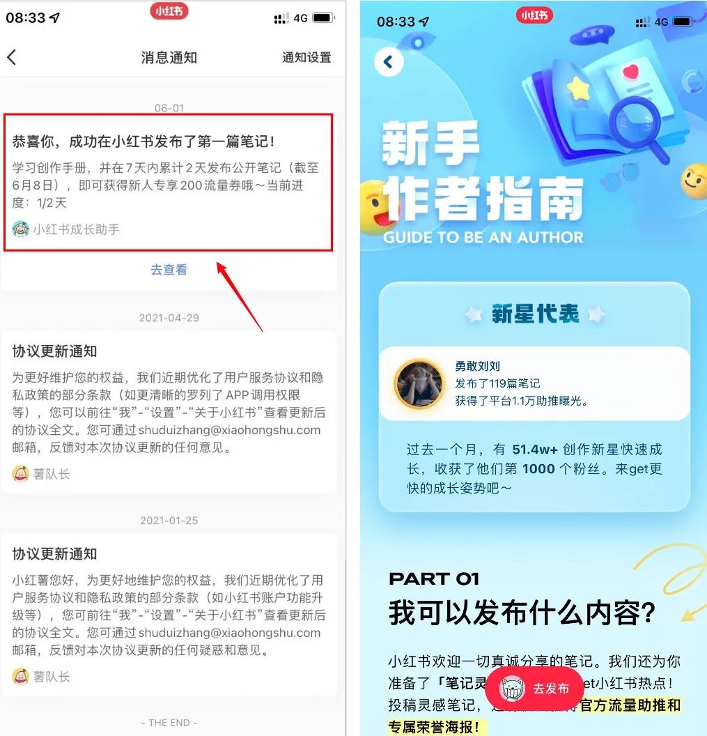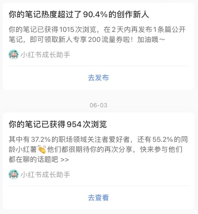 首先第一個關鍵點是,給到創(chuàng)作者即時反饋,讓用戶體驗到創(chuàng)作的快樂。比如運營社剛發(fā)布一篇筆記,官方賬號就來點贊了。很顯然,這個是小紅書運營針對用戶,做的首篇內容發(fā)布的產品反饋機制,真的有用,用戶會感覺自己被鼓勵到了。除此之外,筆記獲得的流量,平臺還會通過私信的方式進行實時數據反饋,“筆記熱度已超過 xxx 人”等字樣讓人很有成就感。不知不覺中,讓創(chuàng)作者在平臺產生了沉沒成本,不舍得輕易放棄創(chuàng)作、丟下這些數據。2)提供流量扶持,讓創(chuàng)作“成癮”