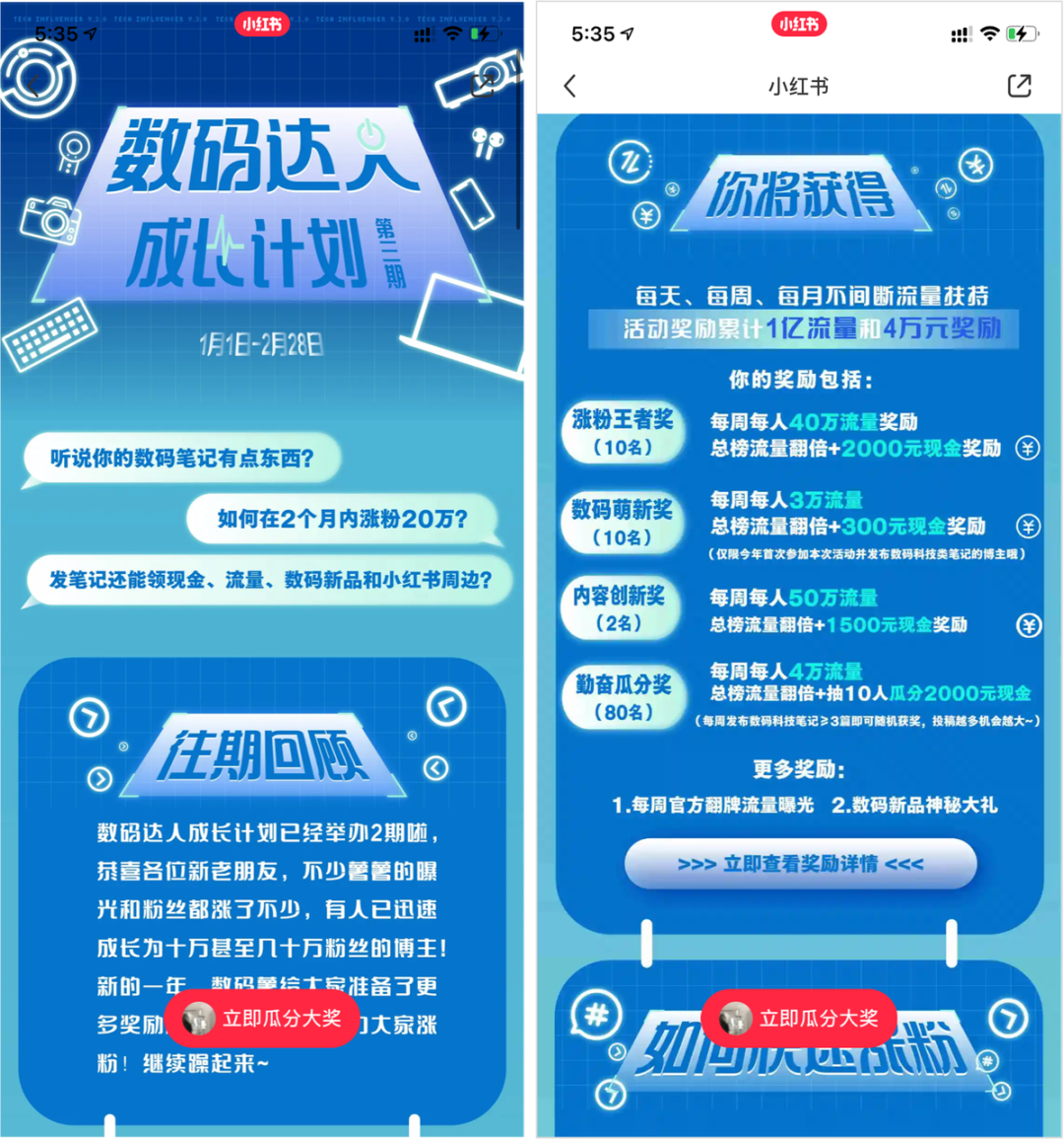 比如小紅書在做數碼類內容的時候,引入創(chuàng)作者的方式就是發(fā)起達人成長計劃的活動,通過流量激勵和現(xiàn)金激勵,激勵創(chuàng)作者們進行內容創(chuàng)作。