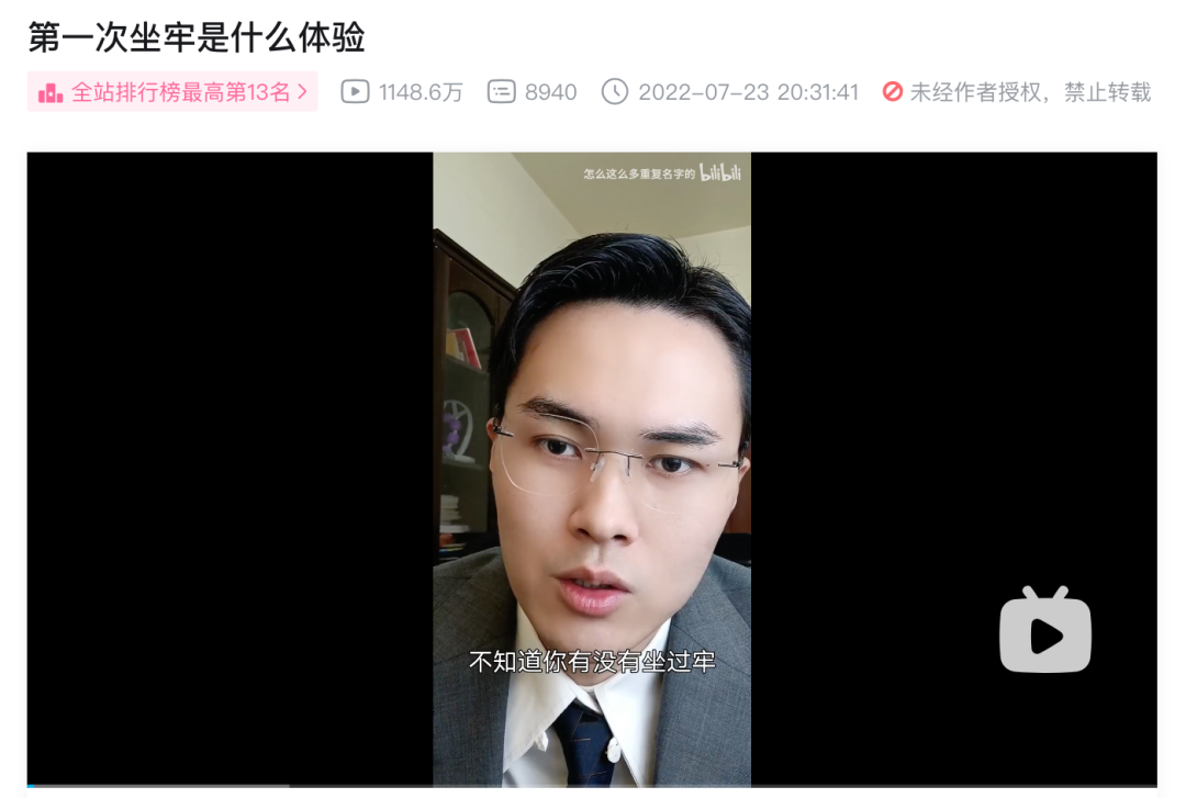 但他最火的還是這個(gè)視頻:《第一次坐牢是什么體驗(yàn)》,分享了他朋友第一次坐牢的經(jīng)歷且還讓他“頂風(fēng)作案”做偽證的尷尬事。在 B站這條視頻足足有 1148w 的播放,8940 條彈幕,足見(jiàn)廣大網(wǎng)友對(duì)坐牢經(jīng)驗(yàn)是多么的感興趣。