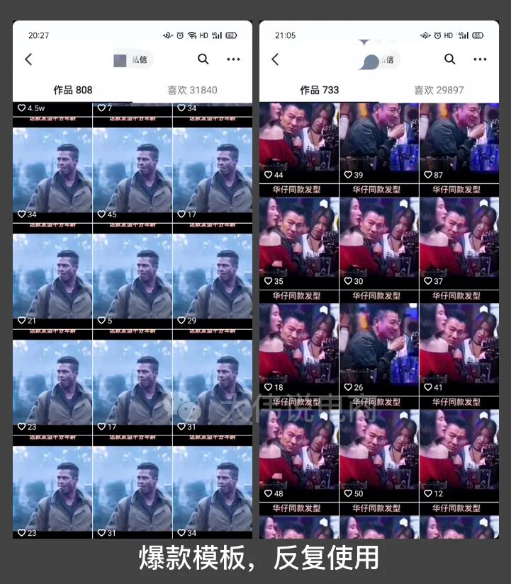一樣的明星臉開頭,一樣的混剪使用方法,一樣的 BGM,一樣的文案;最大程度把內(nèi)容創(chuàng)作成本降到最低。同樣也能很好解決,內(nèi)容可持續(xù)的問題。