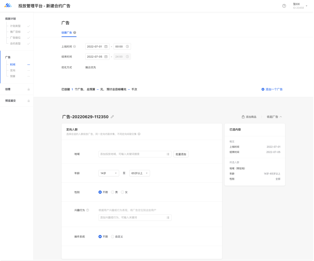 廣告可設(shè)置商品,轉(zhuǎn)化歸因,版位,定向,排期與出價(jià)。