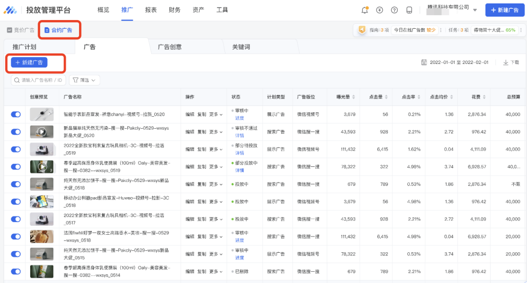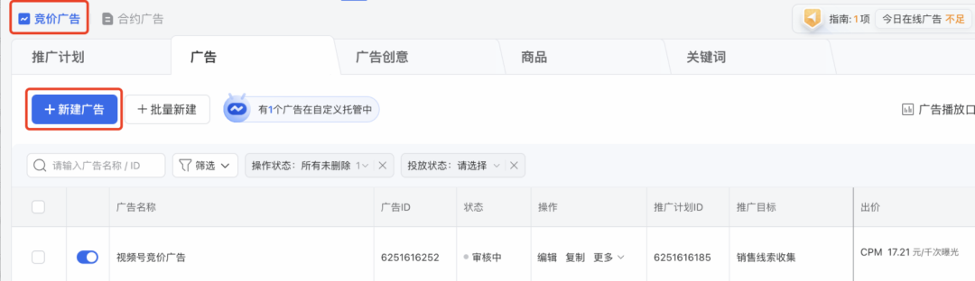 視頻號綁定成功后,可進(jìn)行廣告投放。點(diǎn)擊“競價(jià)廣告"下的“新建廣告"可開始創(chuàng)建。