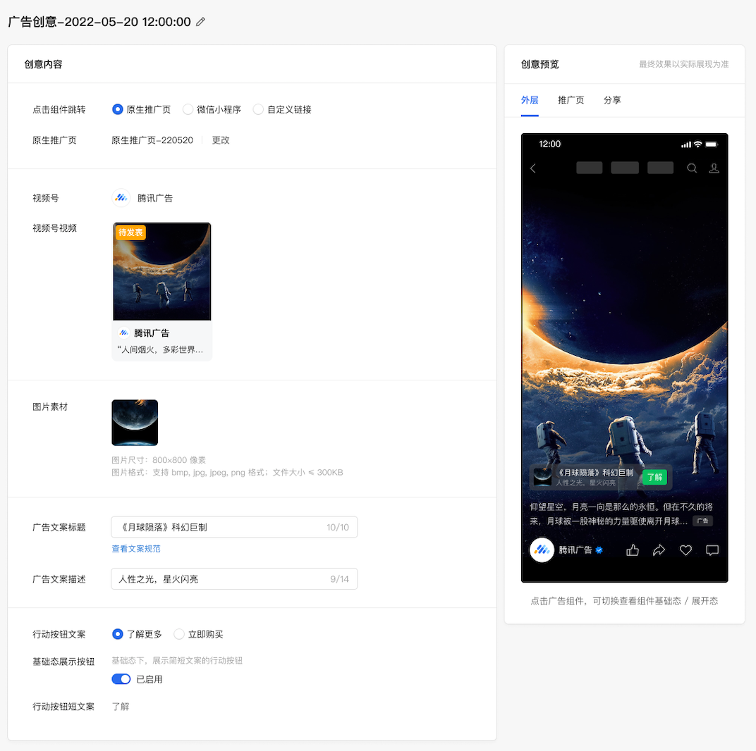 視頻號素材準(zhǔn)備在廣告授權(quán)綁定的視頻號內(nèi)已上傳廣告視頻素材,建議儲(chǔ)備10條以上視頻,可選擇【已發(fā)表】視頻作為廣告素材,注意,視頻號視頻必須包含文案才可作為廣告素材。建議選擇吸引力較強(qiáng),在視頻號內(nèi)自然播放表現(xiàn)較好的視頻。