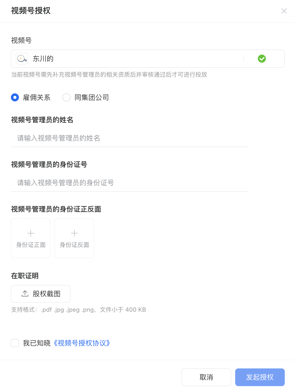 如果視頻號主體與廣告主投放賬戶的主體不同,輸入要投放的視頻號名稱,點(diǎn)擊校驗(yàn)并勾選協(xié)議后發(fā)起授權(quán),發(fā)起授權(quán)后,按對應(yīng)操作填寫對應(yīng)支持的商業(yè)模式,并提交相關(guān)證明材料。在視頻號管理員微信掃碼確認(rèn)授權(quán)后,且相關(guān)資質(zhì)材料廣審?fù)ㄟ^后才可以綁定成功。