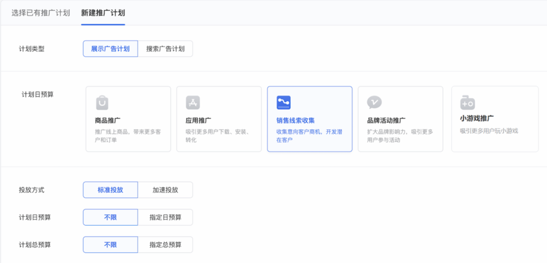 推廣計(jì)劃選擇「展示廣告計(jì)劃」,推廣目標(biāo)支持商品推廣,應(yīng)用推廣,銷售線索收集,品牌活動(dòng)推廣,小游戲推廣,公眾號推廣(白名單)。投放方式,計(jì)劃日預(yù)算/總預(yù)算可根據(jù)投放需求自行設(shè)置。(下圖示例:推廣目標(biāo)為銷售線索收集)