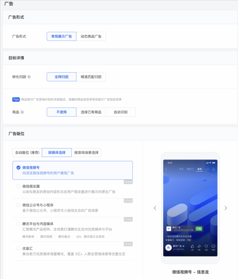 (1)廣告形式:微信視頻號版位僅支持"常規(guī)展示廣告",選擇"動(dòng)態(tài)商品廣告(mDPA)"時(shí),不支持選擇微信視頻號版位。