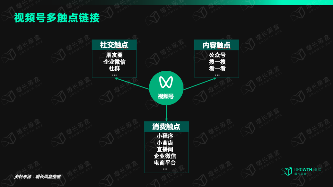 通過這幾場視頻號演唱會,增長黑盒觀察到上線兩年多的視頻號,正在快速地與公眾號、小程序、企業(yè)微信等其他微信觸點打通融合,甚至連接電商平臺等外場域。視頻號不再是單純的內容組件,而成為微信生態(tài)流量集散樞紐,具備強大的連接力。透過現(xiàn)象看本質,我們不難發(fā)現(xiàn),對于品牌營銷而言,視頻號最大的魅力就在于它的連接力。如何吸引消費者?如何與消費者建立聯(lián)系?如何引導消費者進行購買?是品牌營銷恒久不變的靈魂三問。視頻號在微信生態(tài)中的強大連接力,正在助力品牌在新的營銷環(huán)境下實現(xiàn)“找到-吸引-轉化”的完整閉環(huán)鏈路。首先,視頻號自身作為內容載體之外,還連接了品牌公眾號、搜一搜、看一看等內容觸點,讓品牌能夠通過內容吸引消費者。增長黑盒觀察到,品牌的公眾號標簽頁可以直接進入品牌視頻號主頁,用戶在搜索品牌內容時也會跳出相關視頻號。其次,視頻號與朋友圈、企業(yè)微信、社群等社交觸點連接,幫助品牌與消費者建聯(lián)。品牌視頻號內容可以分享至朋友圈、1v1對話框,被觸達觀眾可以在視頻號主頁添加企業(yè)微信、進入社群進行深入了解,品牌可以與消費者進一步對話。最后,視頻號與微信消費觸點的打通,更直接地引導消費者轉化。品牌視頻號內容下可以嵌入小程序、小商店鏈接,甚至可以直接跳轉至電商平臺進行下單,而品牌通過視頻號還能直接引導用戶添加企業(yè)微信,便于后續(xù)的運營和復購轉化。至此,我們不難發(fā)現(xiàn),視頻號與多觸點的連接,正在逐步幫助品牌在微信生態(tài)中打造品牌營銷閉環(huán)。