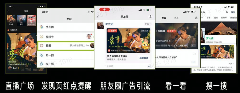從幾次破圈的視頻號演唱會中,我們不難發(fā)現(xiàn),夠獨特夠吸引人的內容,往往戳中了某個圈層用戶的興趣點(例如羅大佑懷舊、崔健本土搖滾、后街男孩歐美黨...)。用這樣一份自帶號召力的內容撬動一個群體,他們不僅會參與,還會自發(fā)地傳播,從而吸引更多圈外用戶來圍觀,最終破圈。這便是超級內容之所以稱為“超級”的制勝法寶——自傳播性。這里所講到的用戶自傳播,與品牌聯(lián)合平臺策劃的曝光路徑是兩個概念,因為用戶自傳播完全是基于內容的吸引力,并且不會產生額外的營銷費用。從傳播途徑來看,以往的超級內容自傳播,會在多渠道跳轉,廣而散。而這次的視頻號演唱會,還借力了騰訊生態(tài)的一大自傳播陣地優(yōu)勢——朋友圈。不得不說,與視頻號共享同一個生態(tài)的朋友圈,是演唱會最具優(yōu)勢的自傳播陣地:(以下結論來源于問卷調查)以崔健演唱會為例,有46%的調研用戶在朋友圈轉發(fā)中獲取演唱會信息,有34%的調研用戶在朋友聊天框轉發(fā)中獲取演唱會信息,有20%的調研用戶是在微信看一看中獲取演唱會信息。再以羅大佑演唱會為例,有51%的調研用戶在朋友圈轉發(fā)中獲取演唱會信息,有28%的調研用戶在朋友聊天框轉發(fā)中獲取演唱會信息,有16%的調研用戶是在微信看一看中獲取演唱會信息。當然,視頻號既然要商業(yè)化,鍛造好內容不僅是服務廣大用戶的,更要為品牌帶來利好。因此,在上述圍繞興趣圈層實現(xiàn)破圈的基礎上,還可加入品牌的位置。整體上,龐大的粉絲群體形成的聲量,會觸達到“圈外”消費者,擴大品牌心智對潛在用戶的觸達范圍。圈外消費者的獵奇心理,會對該粉絲群形成圍觀效應,又增加了品牌的話題性,反哺品牌的滲透力。(下個部分我們會詳細拆解品牌如何在營銷事件中找到自己的定位)從崔健、羅大佑的單藝人演唱會,到多位搖滾藝人參與的你要好好的搖滾演唱會、再到央視主持人天團,視頻號連續(xù)這幾場演唱會都在內容上不斷突破進化。但對于想嘗試其他調性和風格品牌來說,視頻號所能提供的營銷想象力并不僅限于演唱會。隨著視頻號自身的迭代成熟,越來越多內容形式逐漸成為可能(例如:體育賽事、綜藝活動、IP打造...),未來的內容創(chuàng)作空間巨大。2. 超級曝光+轉化:讓刷屏級內容做到品效合一