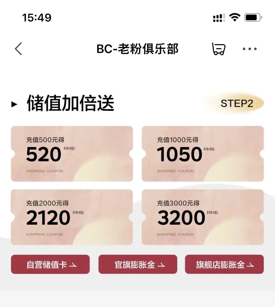 收入最大化:儲(chǔ)值卡定價(jià)在500~3000元,充值越多,優(yōu)惠力度越大,補(bǔ)貼力度從4%-6.7%不等,500元起步相當(dāng)于最低消費(fèi)門檻至少500元,一定程度上保證了品牌的銷售額增加。