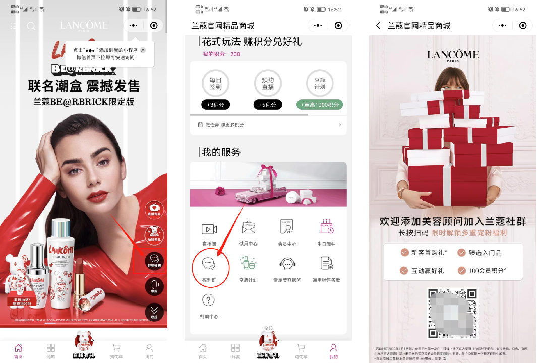 蘭蔻在線下放置了小樣發(fā)放機(jī),添加企微即可獲得兌換小樣,吸引用戶添加企業(yè)微信,再引導(dǎo)進(jìn)入社群。