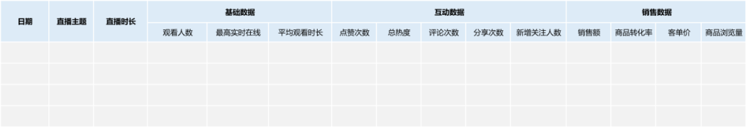 通常直播的數(shù)據(jù)包含以下:日期、直播主題、時長、觀看人數(shù)、最高在線人數(shù)、平均停留時長、點贊次數(shù)、總熱度、新增粉絲數(shù)、銷售量、訂單筆數(shù)、轉(zhuǎn)化率等等。
