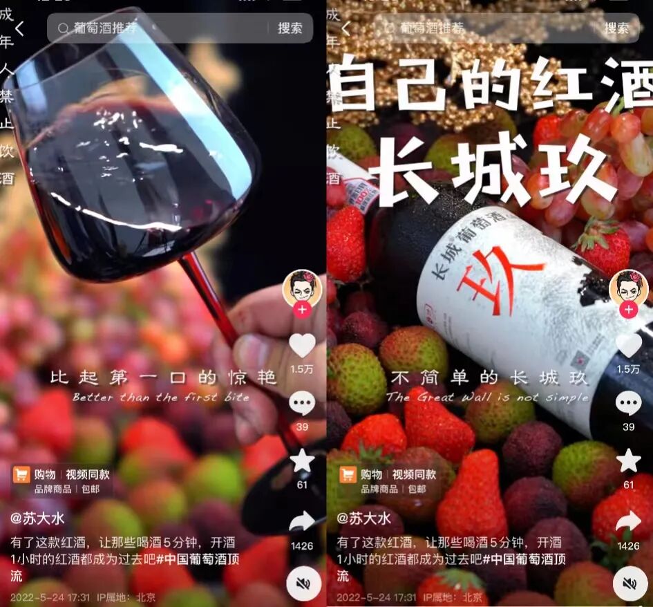 例如抖音博主@蘇大水 將“簡(jiǎn)單喝好酒”作為核心主題。視頻開(kāi)頭就砸破酒瓶,講述傳統(tǒng)葡萄酒難開(kāi)而長(zhǎng)城擰開(kāi)即飲,用沖擊力的畫(huà)面和個(gè)人體驗(yàn)對(duì)比,突出長(zhǎng)城紅酒“喝的方式很簡(jiǎn)單”;又把紅酒放在荔枝、草莓等水果中間,配合紅酒液體搖晃的畫(huà)面,口播描述紅酒好入口而且果味濃,強(qiáng)調(diào)長(zhǎng)城紅酒“享受紅酒很簡(jiǎn)單”。最終用“自己的紅酒,長(zhǎng)城玖”的文案把產(chǎn)品落到了個(gè)人獨(dú)酌的私密場(chǎng)景。