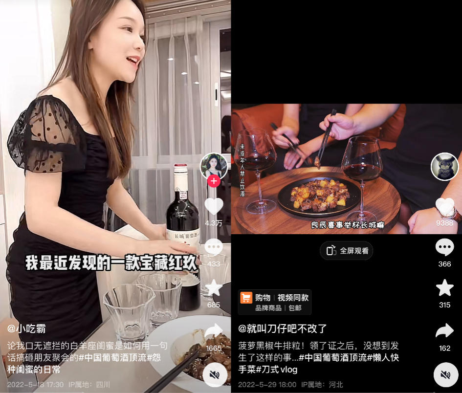 在抖音達(dá)人的共創(chuàng)案例中,@小吃霸 展現(xiàn)的是私人聚會(huì)場(chǎng)景,女生徒手開(kāi)紅酒,圍著餐桌一起喝,閨蜜之間打鬧拌嘴,氣氛輕松快樂(lè);@就叫刀仔吧不改了 則聚焦新婚夫妻的甜蜜晚餐,博主在家中做了道中西合并的菜式,和妻子碰杯喝紅酒過(guò)二人世界,聊著婚禮都是父母準(zhǔn)備他們只選了長(zhǎng)城當(dāng)喜宴紅酒,一條視頻鏈接兩個(gè)場(chǎng)景。
