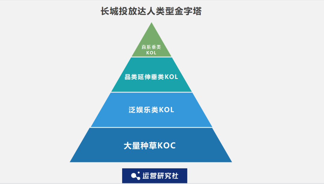不僅如此,長(zhǎng)城在三角投放策略之下,繼續(xù)細(xì)分出了一個(gè)達(dá)人類(lèi)型的金字塔。具體投放就是以種草 KOC 作為鋪墊,由直系垂類(lèi) KOL+泛娛樂(lè)類(lèi) KOL+品類(lèi)延伸垂類(lèi) KOL 三種類(lèi)型作為支撐,以此保證投放的差異化、策略性和性?xún)r(jià)比。