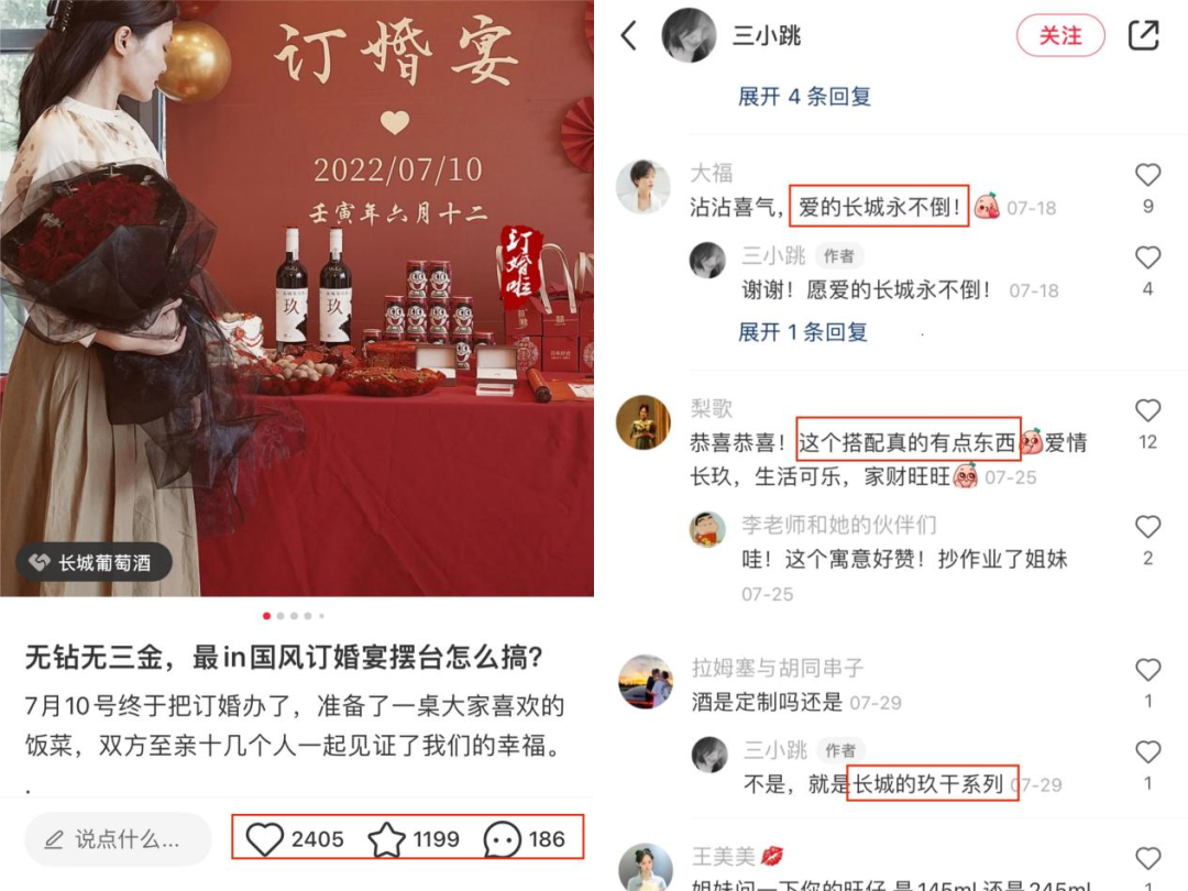 筆記評(píng)論區(qū)互動(dòng)活躍,從用戶(hù)留言關(guān)注的內(nèi)容不難看出,人們對(duì)好寓意的氛圍好物是有強(qiáng)烈的情感需求的,而博主自發(fā)做出的創(chuàng)意酒水搭配,正是幫助長(zhǎng)城從這個(gè)角度融入了訂婚場(chǎng)景。