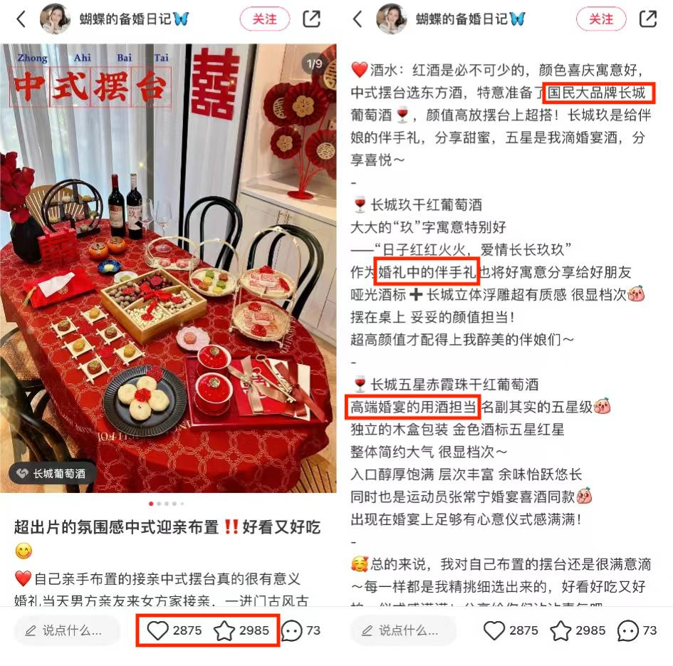 聚焦婚禮場(chǎng)景,長(zhǎng)城邀請(qǐng)真實(shí)備婚中的小紅書(shū)達(dá)人@蝴蝶的備婚日記 共創(chuàng)了一條中式迎親擺臺(tái)布置圖文筆記。分段介紹擺件和選擇理由,內(nèi)容純干貨,收藏量甚至高于點(diǎn)贊量,在備婚人群中強(qiáng)勢(shì)種草。