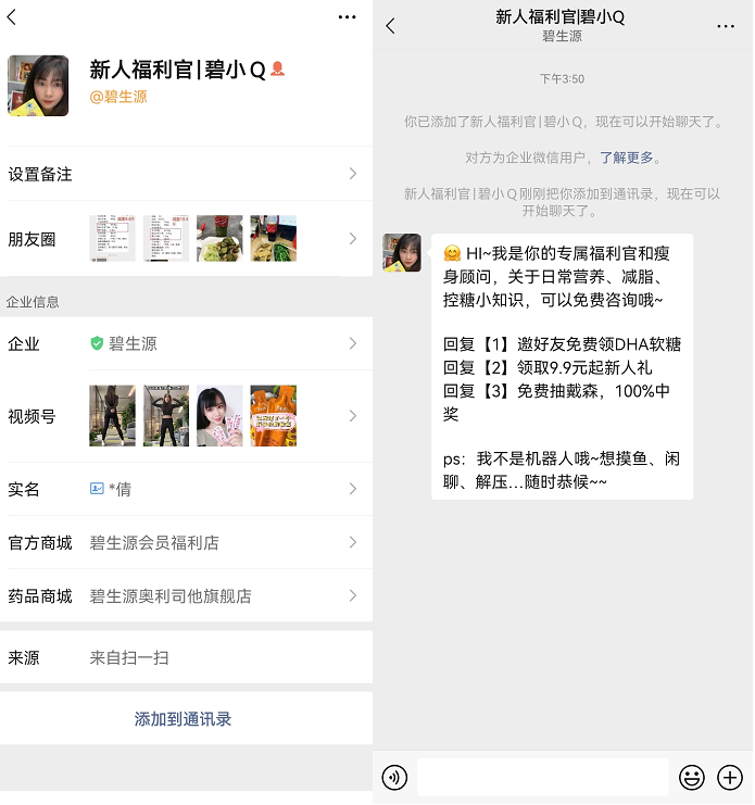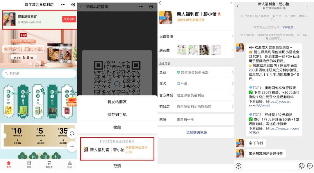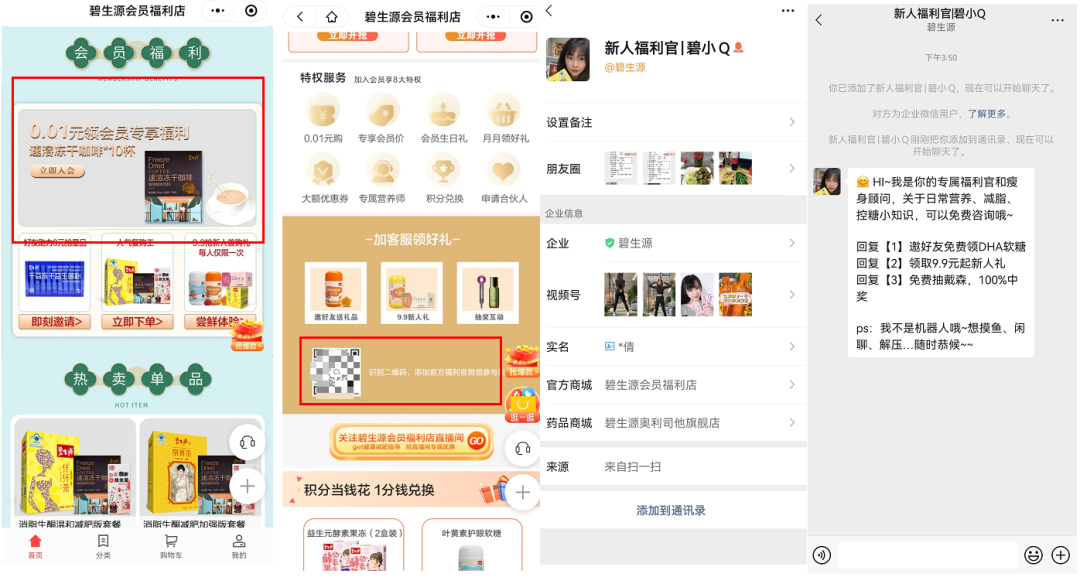 碧生源在小程序的2個(gè)不同位置中,分別引導(dǎo)添加不同的福利官企微,介紹不同的產(chǎn)品和服務(wù),以此做用戶分層。