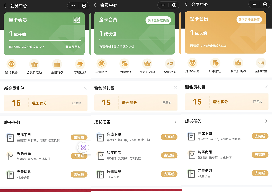鉆卡會(huì)員:權(quán)益包括升級(jí)送500積分、15倍積分、會(huì)員價(jià)活動(dòng)、生日特權(quán)、專屬社群;