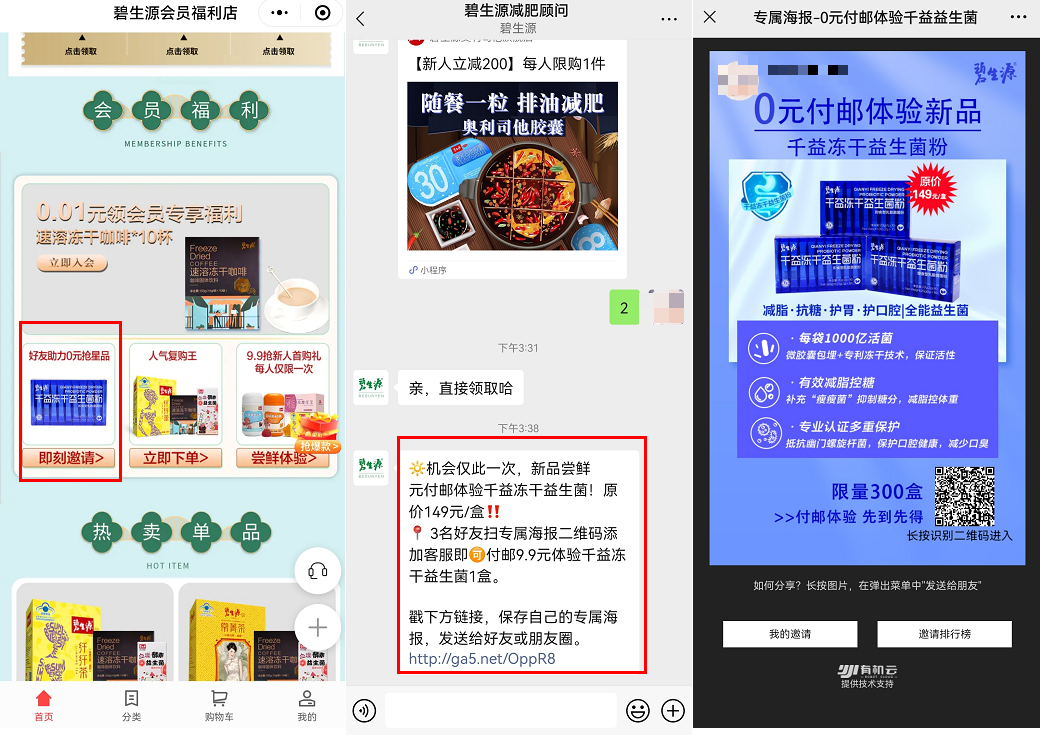 碧生源常做裂變活動(dòng),合理地利用私域資源,實(shí)現(xiàn)拉新和復(fù)購的效果,以小程序、社群為例:
