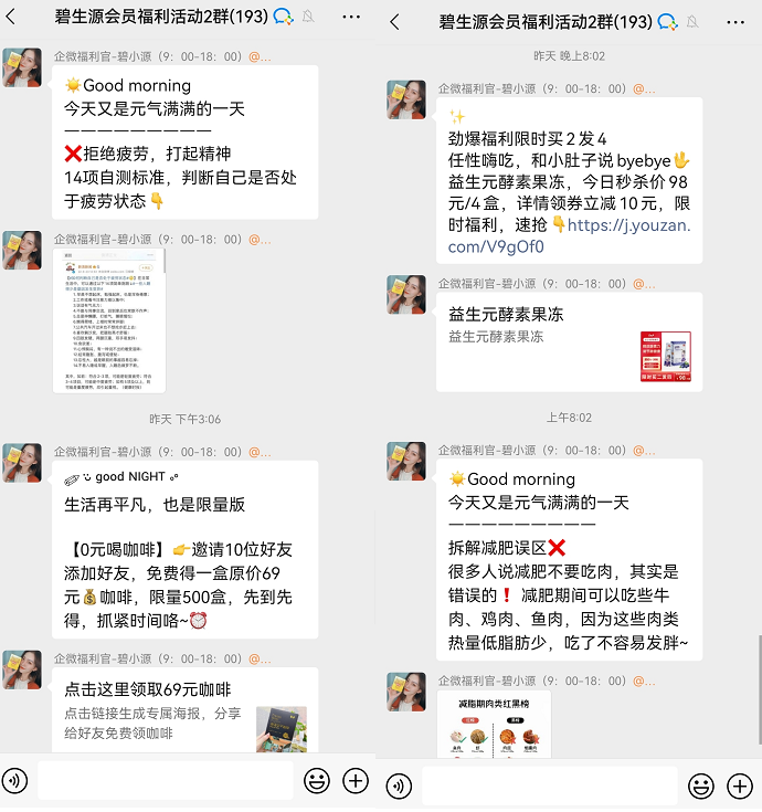 碧生源在疫情期間,迅速建立社群營(yíng)銷,短期內(nèi)獲得60萬私域用戶,產(chǎn)品的復(fù)購率也因此大幅度提升。以我添加的社群為例,進(jìn)行拆解: