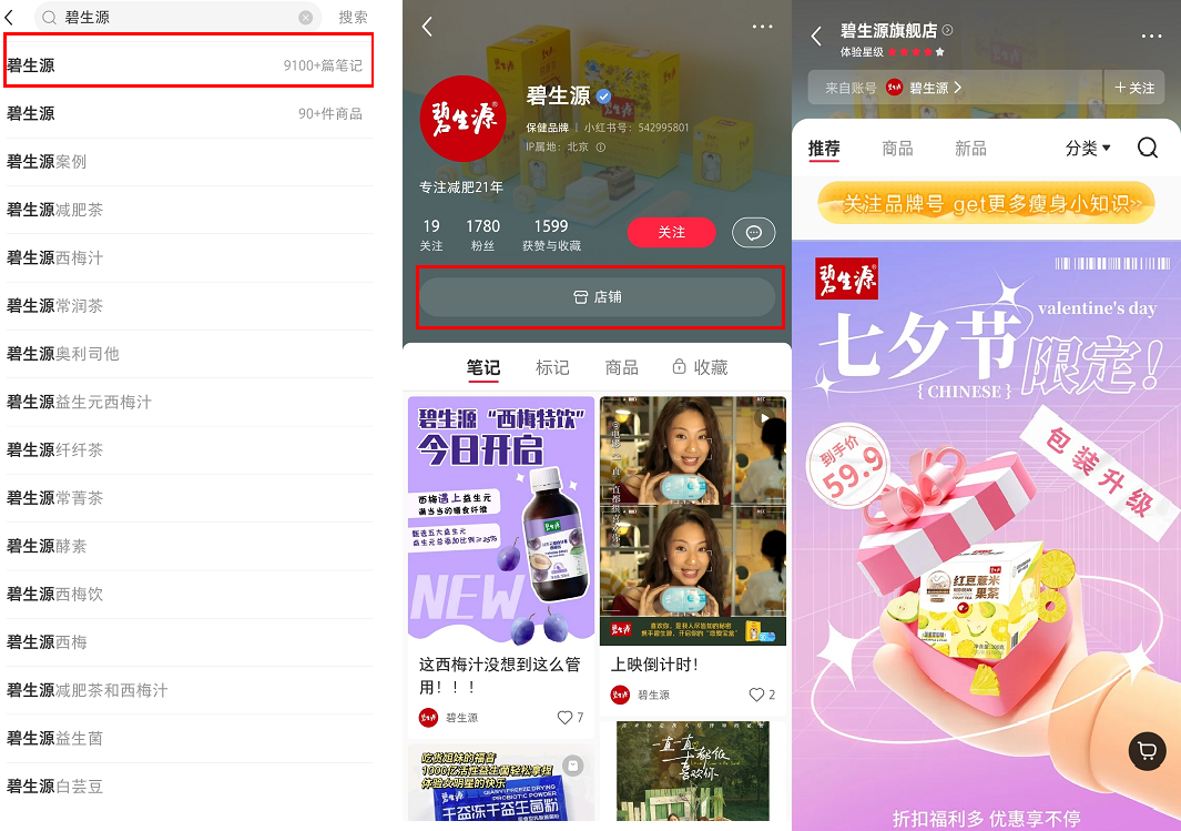 另外,碧生源開通小紅書店鋪,方便用戶能直接在小紅書平臺(tái)下單,以此降低用戶決策,提高變現(xiàn)可能性。