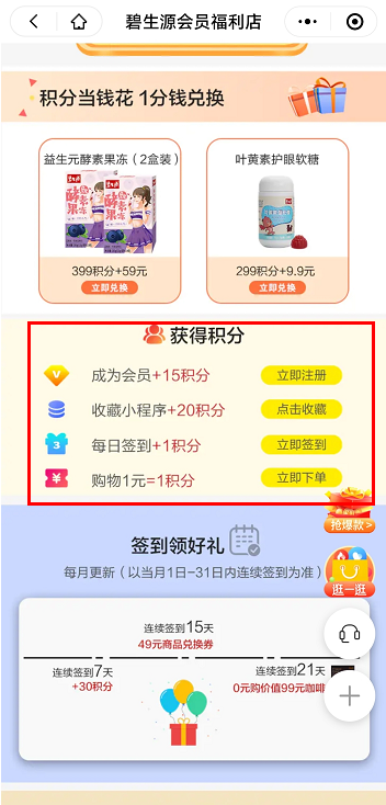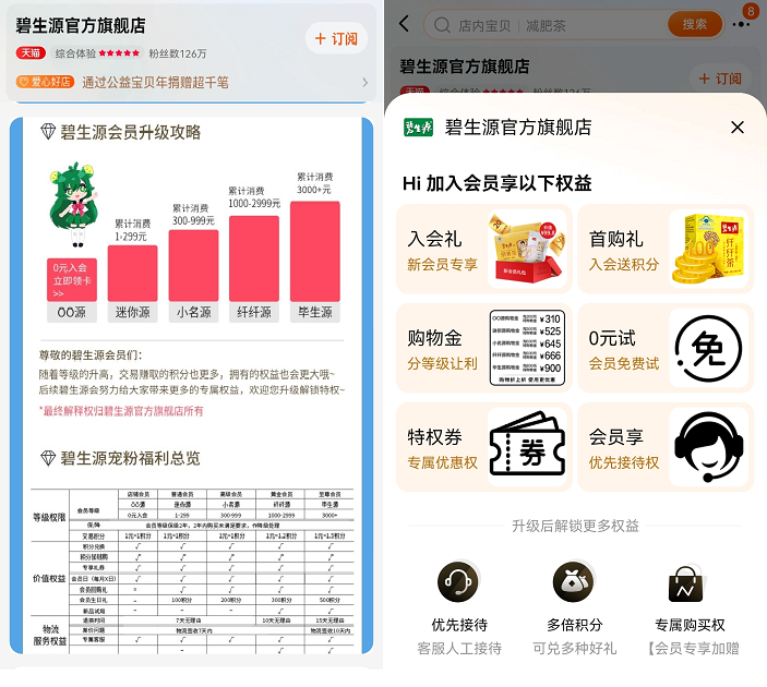 目前碧生源在微信小程序和電商平臺(tái)中都有會(huì)員體系,兩者的模式有所不同,以下:
