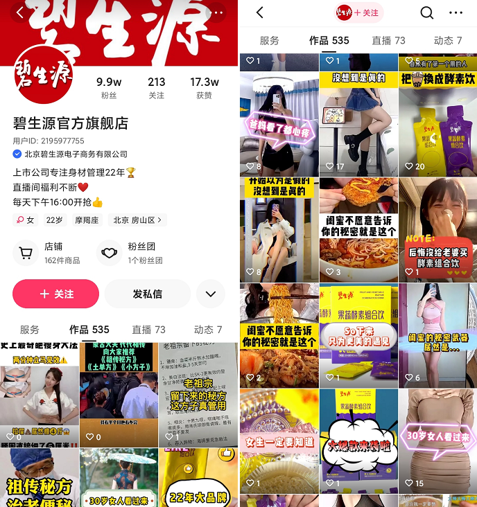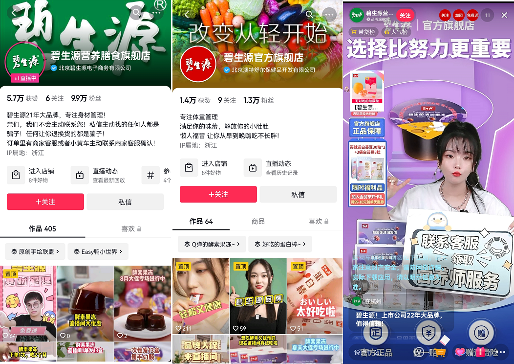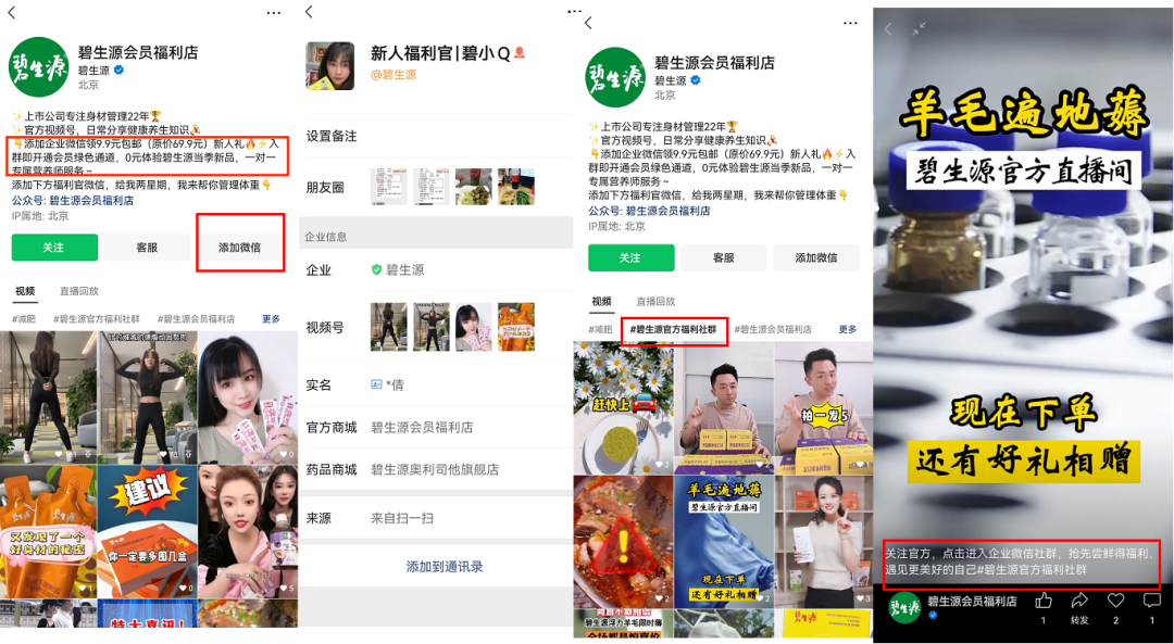 另外,主頁展示了“碧生源官方福利社群”的視頻話題,部分視頻標(biāo)題有引導(dǎo)用戶加入社群。