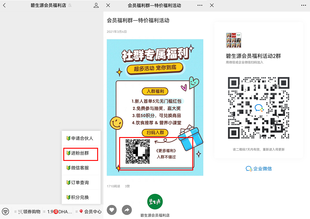 從「碧生源會(huì)員福利店」公眾號(hào)進(jìn)入,在一級(jí)菜單有2個(gè)路徑可以添加企微,加入社群。