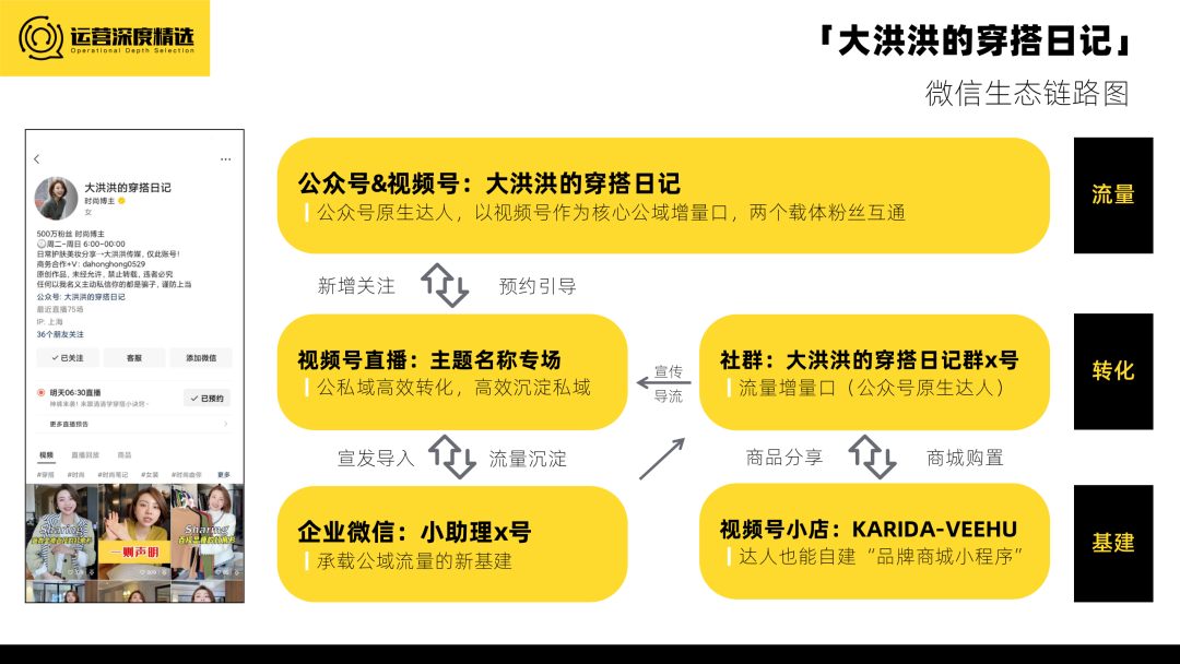 我們再來看“大洪洪的穿搭日記”這個賬號,同樣是圍繞 IP 大洪洪建立起了私域矩陣,不同于暖暖媽的是,將原本作為直播間交易工具的視頻號小店單獨拎了出來放到了社群中,作為在沒有直播的時間段里用戶可以繼續(xù)成交的觸點。