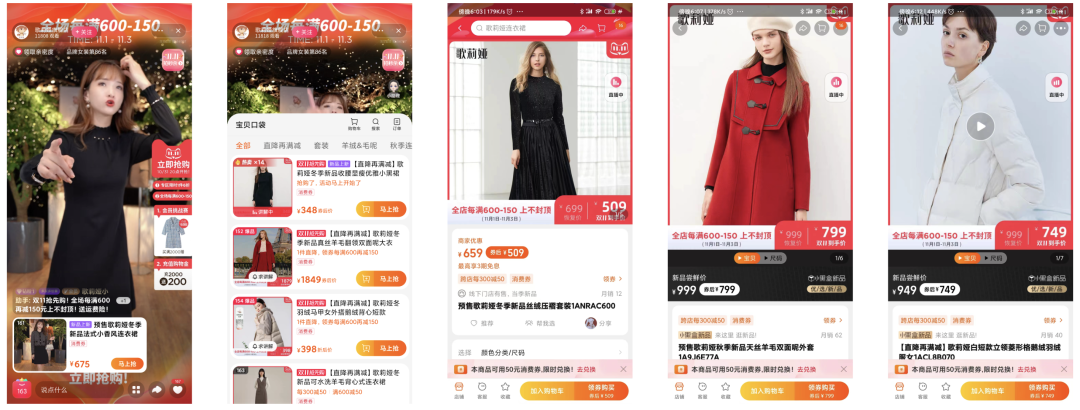 歌莉婭作為傳統(tǒng)女裝品牌,從2019年開始發(fā)力線上渠道,2020年嘗試直播賣貨,在一個月的時間內(nèi)就完成8000多萬元的成交額。這次我們選擇的對比產(chǎn)品為:絲絨壓褶裙、羊毛呢外套、立領鵝絨服。