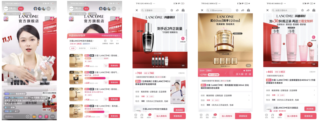 例如購買 30ml 的蘭蔻小黑瓶,在淘寶和視頻號直播間贈送 30ml 同款小樣,在抖音則總送 28ml 同款小樣 + 10ml 極光水。用戶對比后可以根據(jù)喜好選擇直播間下單。