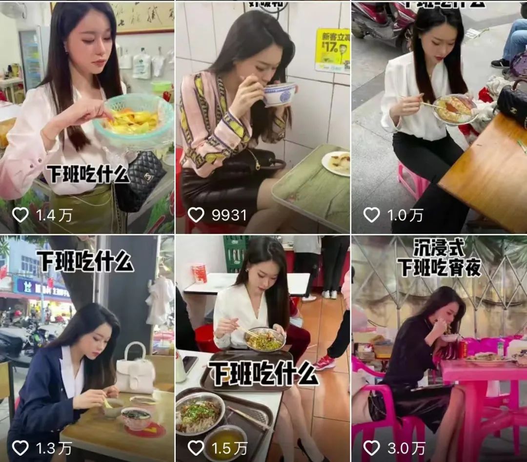 這里分享一個賬號的思路,只去蒼蠅館、小飯店。大長腿美女,走路或者騎電瓶車、自行車,去早餐店、晚餐店、夜宵店。