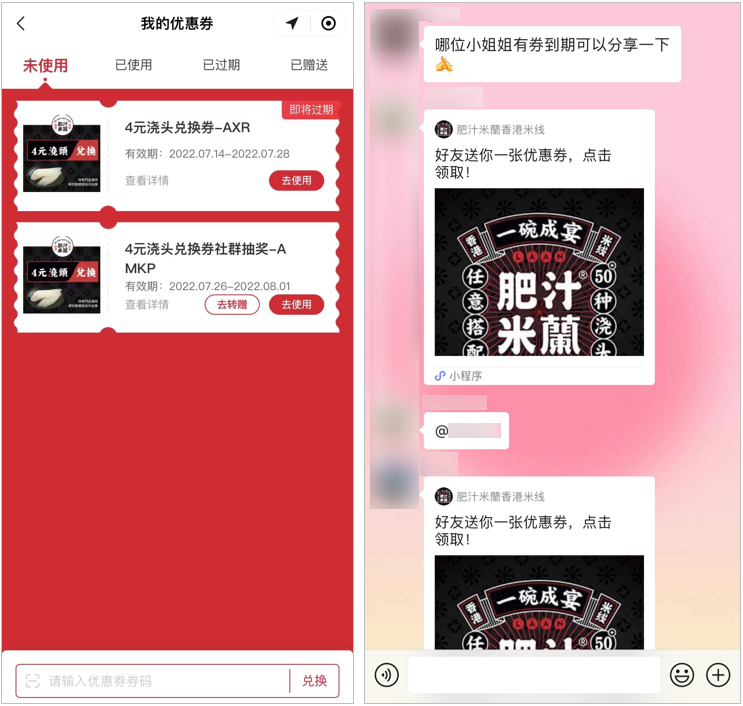 究其原因,是由于肥汁米蘭設(shè)置了“優(yōu)惠券可轉(zhuǎn)贈”這一小“心機”。