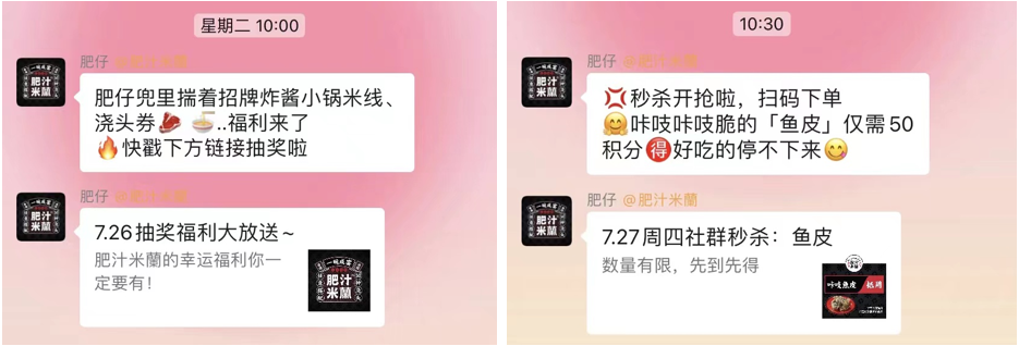這是肥汁米蘭基于用戶感受作出的考量。由于門店社群本身就比較活躍,官方就沒有必要老是在群里發(fā)促銷信息,過度的“轟炸”反而會打擾用戶。