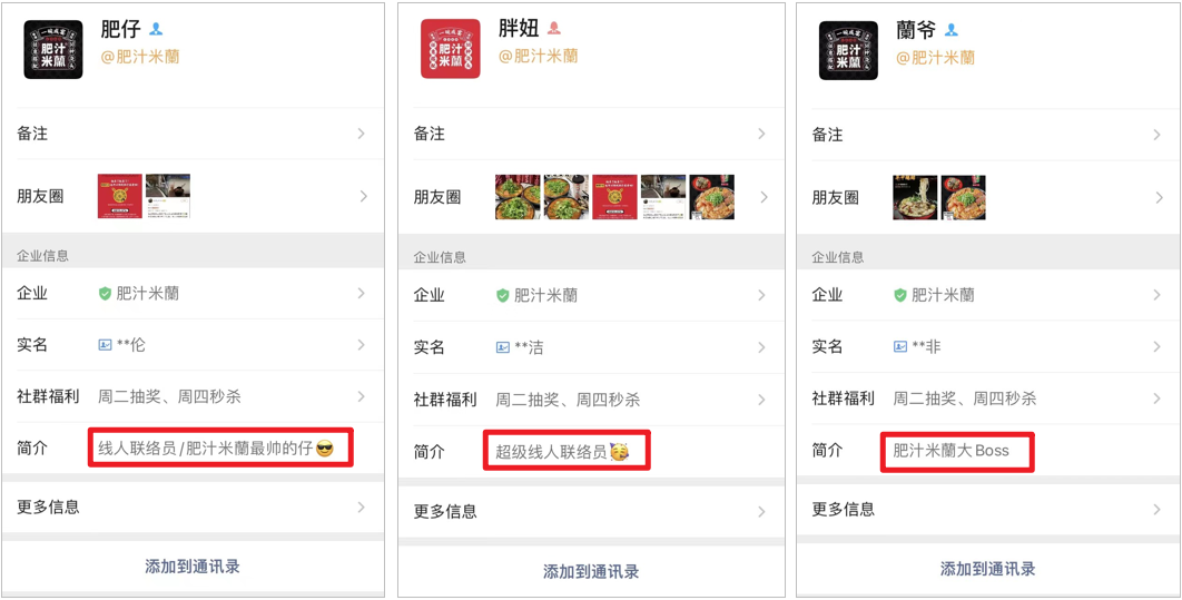 左為肥仔的企微簡介,中為胖妞,右為蘭爺