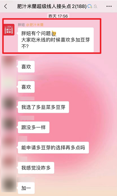 還有一個細(xì)節(jié)是,雖然「超級“線人”群」里有很多人發(fā)言,但是大家的討論主題始終圍繞著「肥汁米蘭」品牌展開,并不會扯到與品牌不相關(guān)的話題。