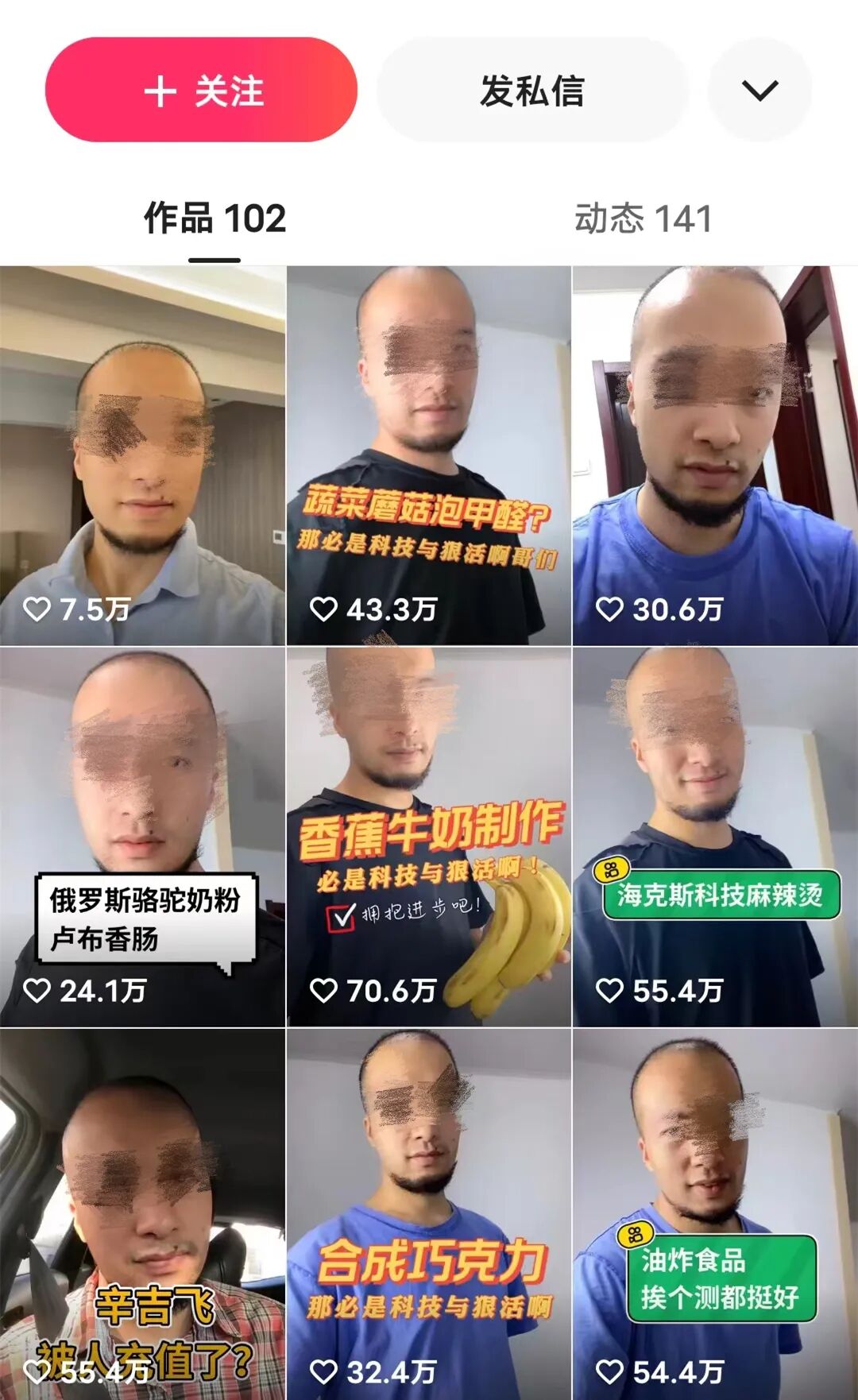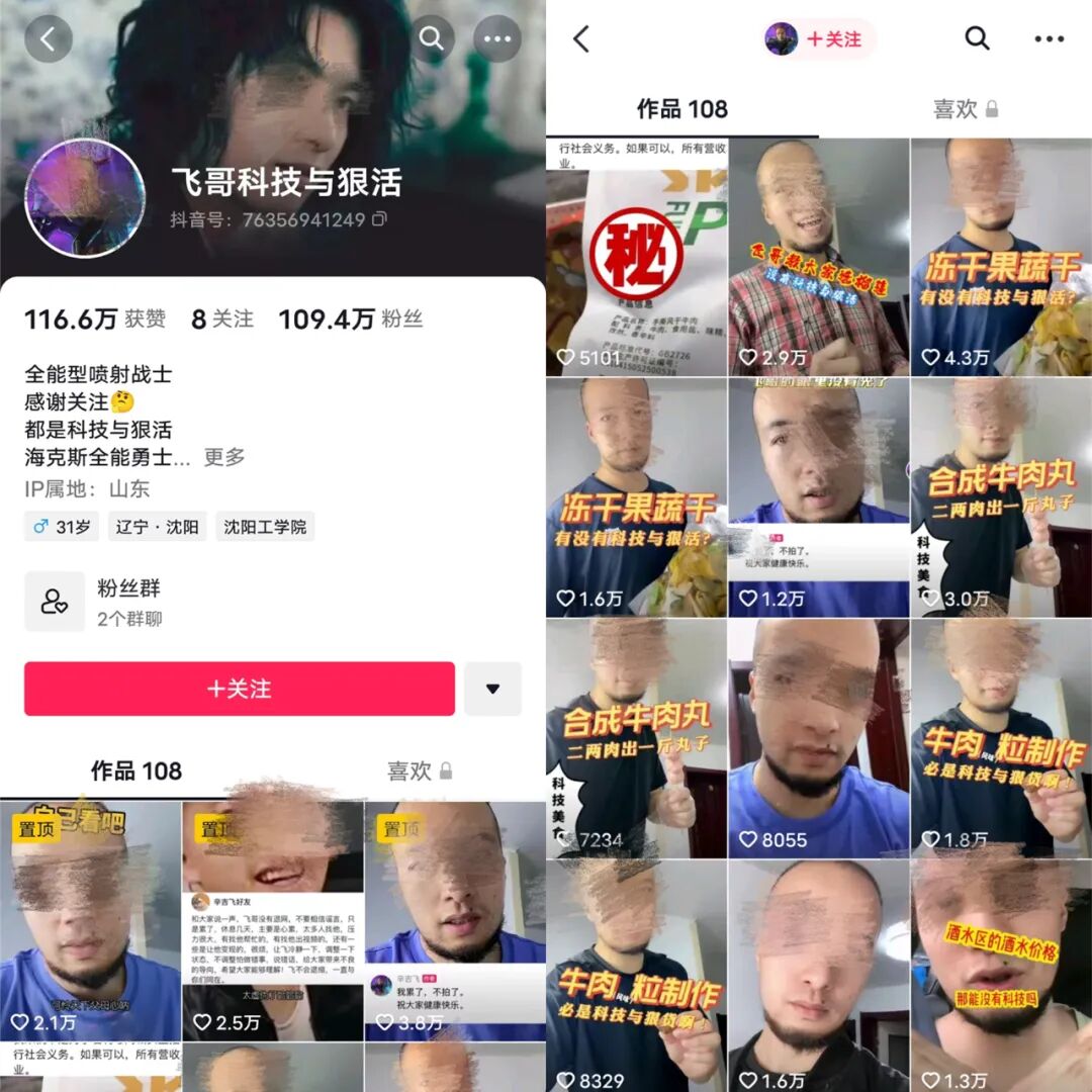 除此之外,抖音等短視頻平臺(tái)中,出現(xiàn)了大量高仿山寨賬號(hào),有的粉絲數(shù)甚至超過(guò)了100萬(wàn),“科技與狠活”逐漸成為網(wǎng)絡(luò)日常用語(yǔ)。