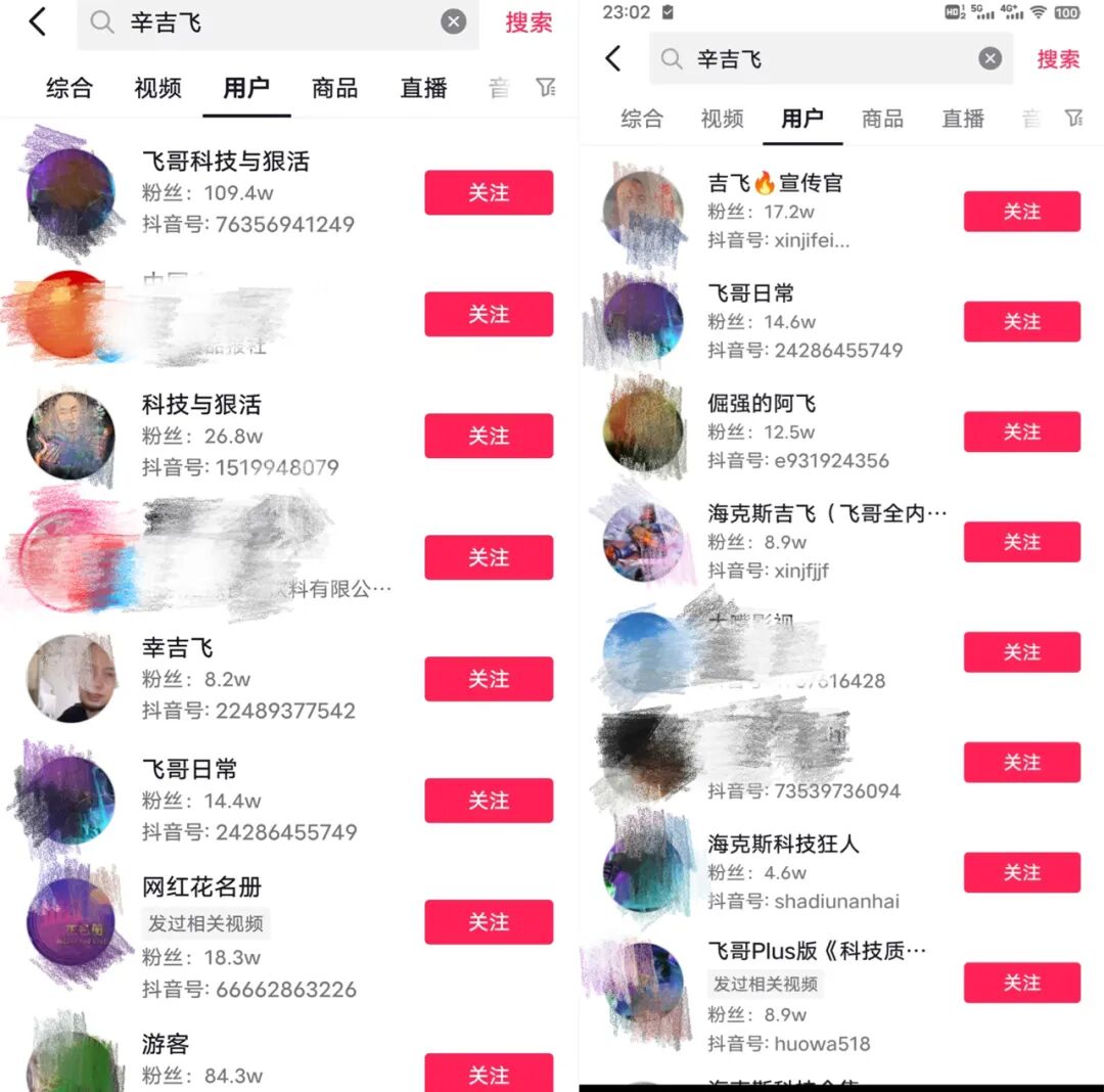 雖然辛吉飛的抖音賬號(hào)注銷了,但他在抖音上的視頻卻沒有消失。因?yàn)樽罱粋€(gè)月以來(lái),出現(xiàn)了大量的高仿號(hào)。粉絲數(shù)少的有幾萬(wàn),多的高達(dá)百萬(wàn)級(jí),也是離了大譜。