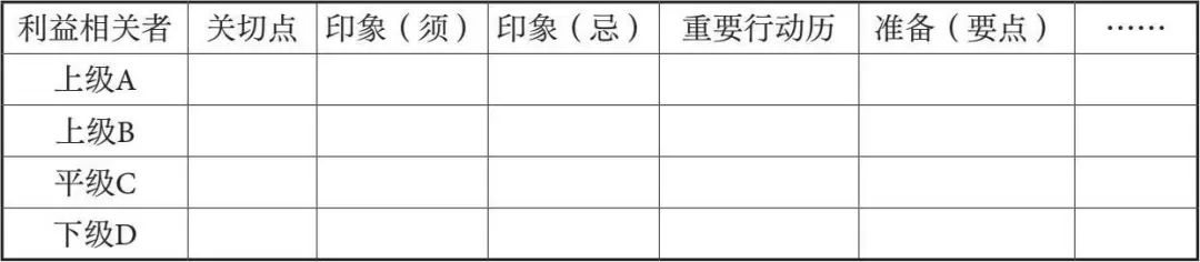 怎么用,我們舉兩個(gè)例子。比如說,上級(jí)A,是直屬上級(jí),比較成熟穩(wěn)重。那么,必須建立與保持的印象:信任。必須避免的印象:吊兒郎當(dāng),不靠譜。1,關(guān)于工作的重要想法,要和上級(jí)提前溝通。2,上級(jí)的要求,要認(rèn)真思考,及時(shí)反饋。再比如說,上級(jí)B,是上級(jí)A的上級(jí),他屬于對(duì)數(shù)字很敏感,又很務(wù)實(shí)的人。那么,必須建立與保持的印象:勝任。敢打仗,會(huì)打仗。必須避免的印象:不干脆不利索,含含糊糊,推卸責(zé)任。1,重要的經(jīng)營數(shù)字,必須記住和更新,突然問到時(shí),能了如指掌,脫口而出。2,匯報(bào)要清晰完整,如果有差異,必須要說清楚,以及提出相應(yīng)的解決方案。所以,你可以做一個(gè)表格。這樣,就對(duì)重要的利益相關(guān)者,有了明確的認(rèn)識(shí),也知道應(yīng)該怎么做,有清晰的“歷法”。處理好重要關(guān)系的要訣,就是四個(gè)字:同理,共情。這不是讓我們喝酒應(yīng)酬,也不是讓我們溜須拍馬,而是讓我們正確認(rèn)識(shí)關(guān)系,更好地做好自己的工作,達(dá)到你希望達(dá)到的影響力。否則,我們做的很多事情,都是徒勞的努力,都是無用功。