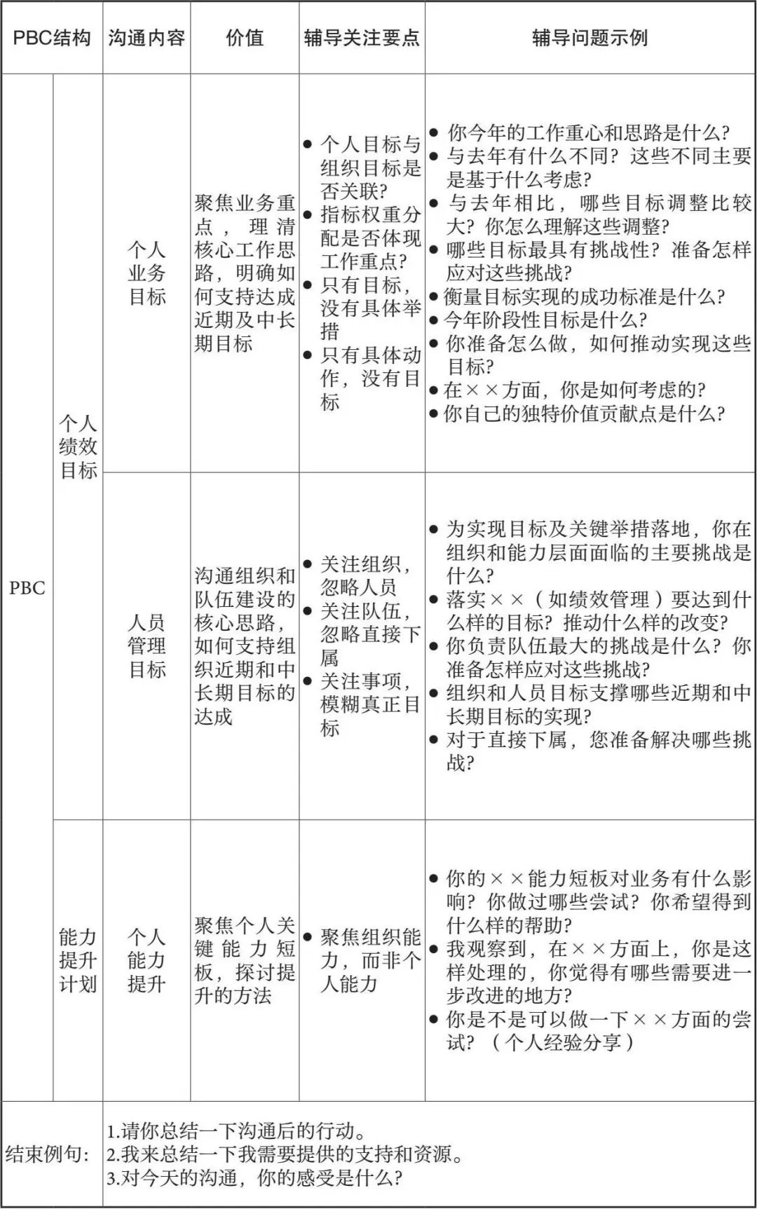 年底了,每個(gè)組織,每個(gè)人都應(yīng)該復(fù)盤。復(fù)盤,不僅是迭代和反思,也是一次提升能力的機(jī)會(huì)。把走過的路,摔過的坑,失敗的教訓(xùn),成功的經(jīng)驗(yàn),都總結(jié)一下。但是,很多管理者和員工,并不真的知道復(fù)盤的意義。管理者會(huì)覺得,事情都干完了,結(jié)果也就那樣了,蓋棺定論,還聊什么呢?為什么在這件事情上花這么多時(shí)間?員工也會(huì)想,年底的績效考核,就是來宣布結(jié)論的。你要批評(píng)我,你要罰我。年底復(fù)盤,也常常會(huì)給人一種剝奪感。“組織對(duì)你有很大投入,你要知道珍惜啊。”但是,他們也許忘了,如果你給的東西不值得,如果你沒有幫助我的成長,那這種說法會(huì)顯得非??尚?。硬塞給我了一個(gè)結(jié)果,還要我接受,那是不會(huì)有人高興的。復(fù)盤的時(shí)候,其實(shí)員工更想知道的是:“我哪里做得不好,希望得到指點(diǎn),并且能有真正的建議?!?/span>“我的時(shí)間,也很寶貴。我也很想努力,我想要成長,但我更想知道如何成長?!?/span>因此,年底復(fù)盤,績效溝通的意義,其實(shí)不是定論過去,而是要面向未來。不是證明我給你的結(jié)果是對(duì)的,而是幫助你變得更好。這個(gè)績效輔導(dǎo)卡,又叫PBC(Personal Business Commitment),個(gè)人業(yè)務(wù)承諾。我也把PBC的表,放在這里,供你參考。你一看就明白了。