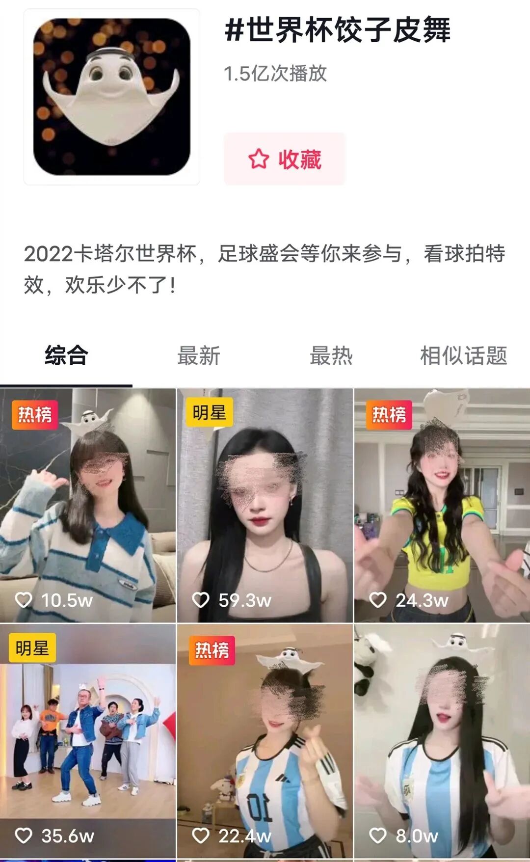 例如“世界杯餃子皮舞”話題,小姐姐們頭頂“拉伊卜吉祥物的卡通人物”,跳著像餃子一樣的舞蹈;