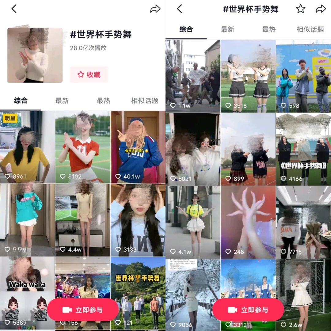 再例如“世界杯手勢舞”話題,小姐姐們穿著短裙,露肚臍的球衣,跳著舞蹈,吸引了大量用戶觀看,兩個話題次數(shù)高達近30億。