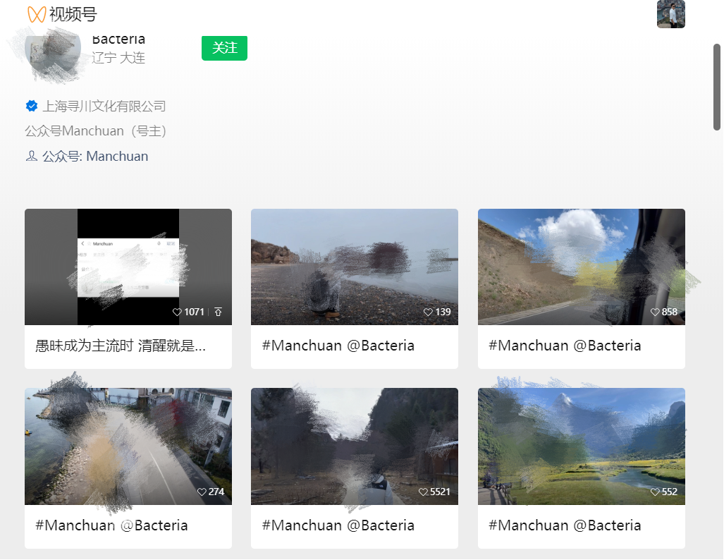或許是基于興趣愛(ài)好,或許是謀求轉(zhuǎn)型,manchuan還做了視頻號(hào),不過(guò)不是情感類型,而是旅行類型。置頂?shù)囊曨l,宣傳引導(dǎo)用戶關(guān)注他的公眾號(hào)。