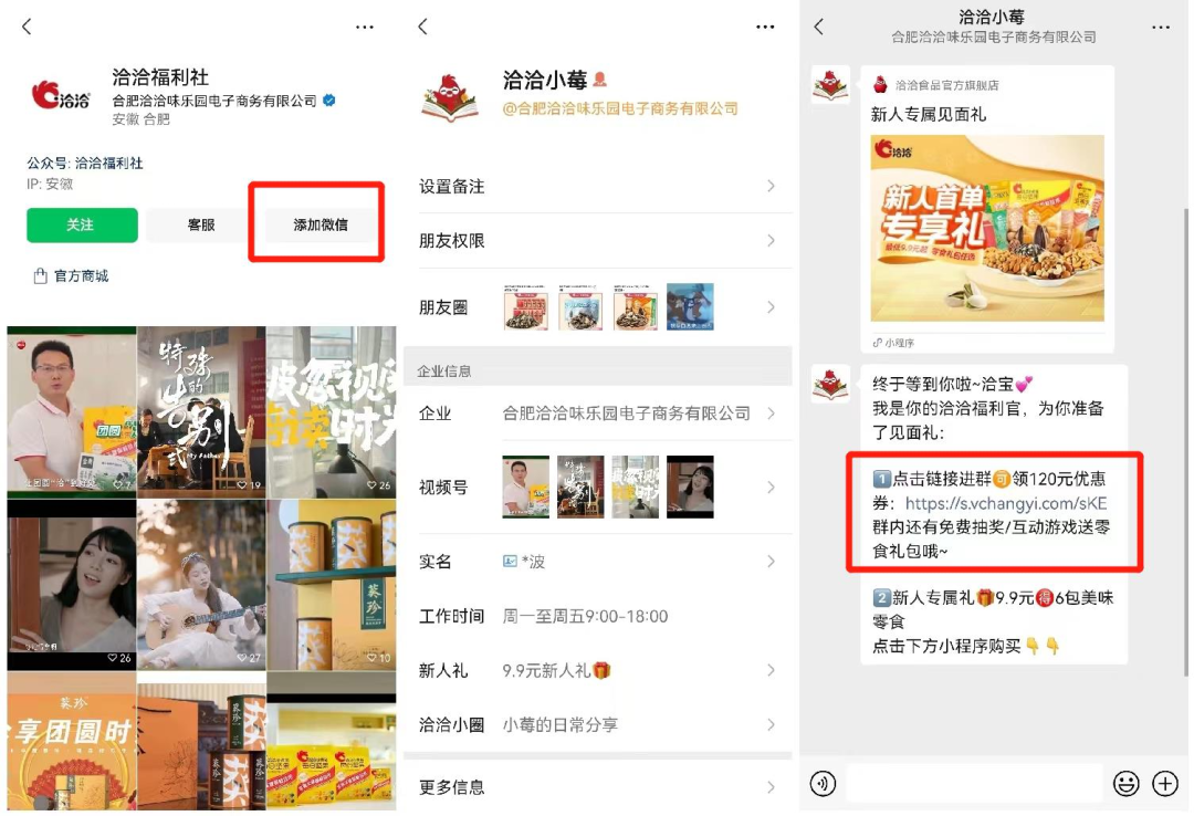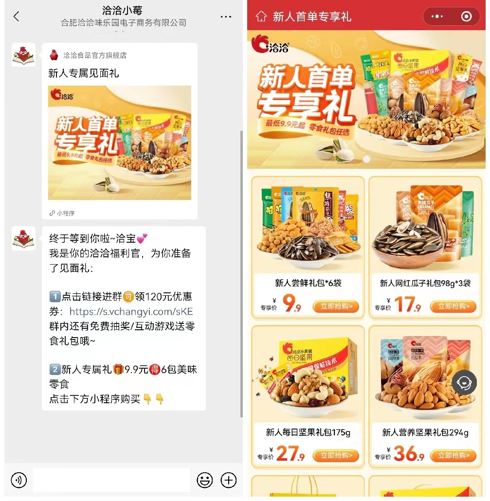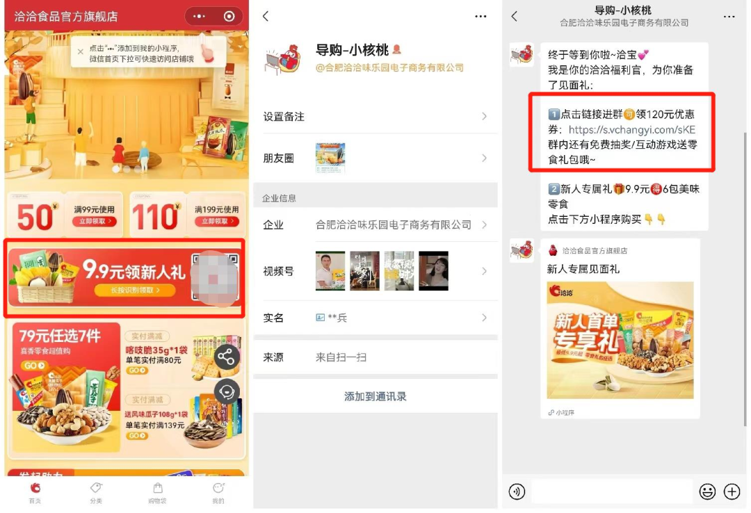引流路徑①:在【洽洽食品旗艦店】的首頁,利用【9.9元領(lǐng)新人禮】的福利吸引用戶點(diǎn)擊,長按即可掃碼添加企微【導(dǎo)購-小核桃】。添加成功,企微自動發(fā)送邀群二維碼。