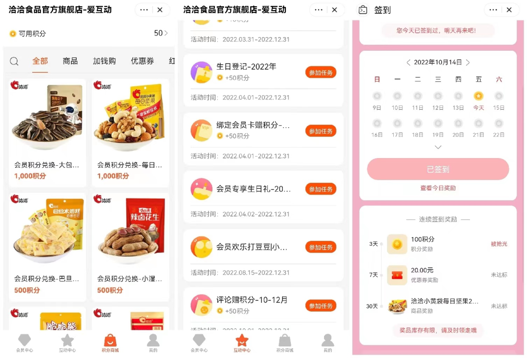 洽洽在微信小程序和電商平臺中設(shè)置了會員體系,兩者都是會員體系+積分體系,福利的內(nèi)容略微會有不同。
