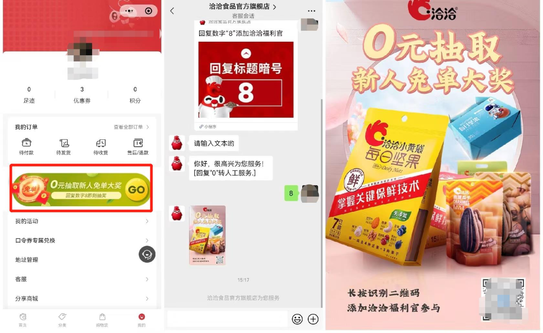 引流路徑②:在商城個人中心,用【0元抽免單大獎】福利吸引用戶,點(diǎn)擊進(jìn)入后,會跳轉(zhuǎn)到在線客服對話框,在對話框右下角會有提示回復(fù)關(guān)鍵數(shù)字“8”,回復(fù)后會自動跳出福利官【小核桃】企微海報(bào),添加后即可入群。