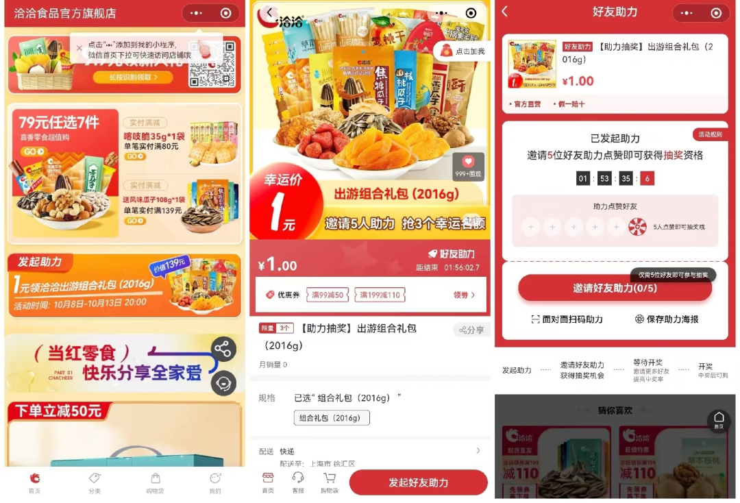 洽洽會推廣一些限時裂變活動,如【0元免費(fèi)領(lǐng)零食】活動,通過獎品限時限量福利,吸引用戶參與。用戶邀請好友進(jìn)行助力,邀請?jiān)蕉嗪糜眩剟钤蕉唷?/span>