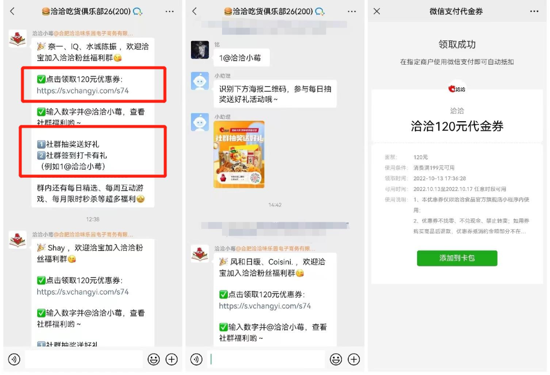 社群入群歡迎語及群公告:用戶入群后會第一時間觸發(fā)自動歡迎語,主要引導(dǎo)領(lǐng)取120元優(yōu)惠券和回復(fù)關(guān)鍵數(shù)字并@洽洽小莓,查看福利。